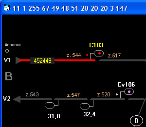 - Chaque clic sur un n° de CDV au TCO fait passer ce CDV du statut de "libre" à "occupé" et vice-versa. Bien évidemment, les conséquences sont les mêmes que s'il s'agissait d'un train (par exemple présentation de l'indication S au signal amont)