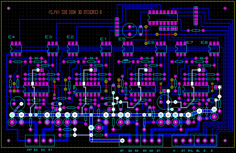 Le dessin ci-contre représente un agrandissement de la carte 8 CDV. Les composants sont issus d'une bibliothèque assez complète, fournie avec le logiciel ARES de chez Proteus. La numérotation des pattes permet de réaliser une vérification assez sérieuse.
