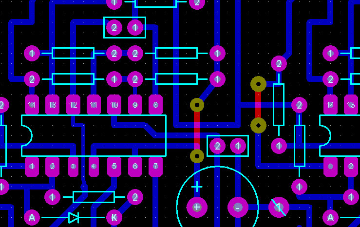Cette application gère la technique multicouche. Toutefois, dans notre cas, nous préférons nous limiter au circuit simple couche, plus facile à réaliser. Les liaisons en rouge sont donc des straps de liaison.