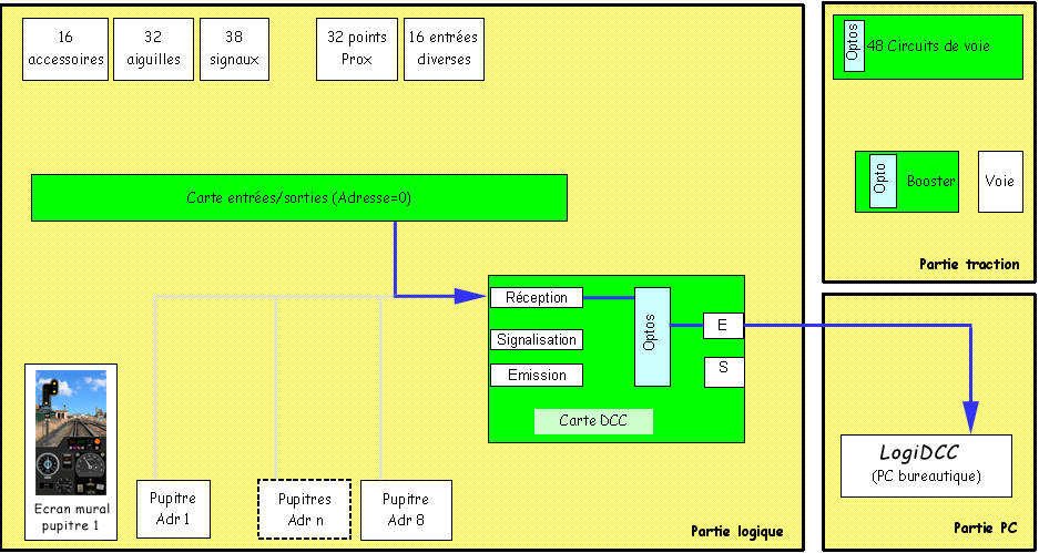 | Synoptique > Interrogation Pupitre 1 > réponse pupitre 1 > infos signalisation pupitre 1 > interrogation carte E/S > réponse carte E/S > infos signalisation E/S > DCC |