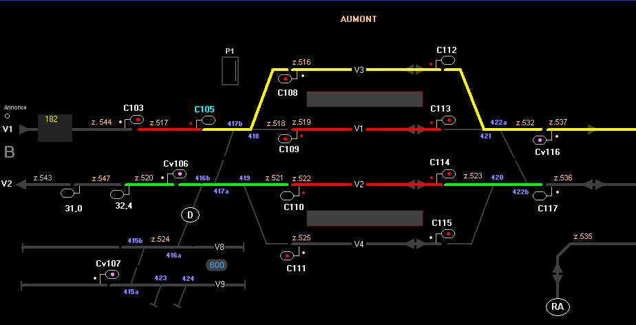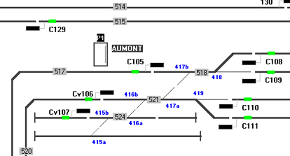 Comme nous l'avons indiqué précédemment, le tracé du TCO est désormais linéaire pour éviter l'effet spaghetti de la version initiale. Toutefois, pour faciliter la navigation sur cette page Web, nous avons coupé l'image TCO en 2 parties. Peu de choses à rajouter après les nombreuses copies d'écran et explications données au chapitre "Notions de signalisation". Rappelons que le TCO affiche la totalité du réseau qui dessert les gares d'Aumont et de Bassange. Les voies du PMV (poste à manettes de voies) ont été sorties du TCO et font désormais partie de la TCC. L'accès se fait par les repères RA et RB. |