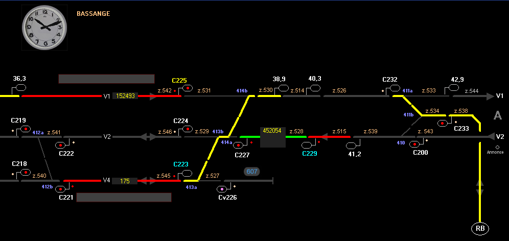 A noter l'étiquette "C225", de couleur jaune, attestant qu'un train est arrêté sur le point prox de ce signal. A l'examen de la barre des pupitres, nous pourrions voir qu'il s'agit de la BB 67493 commandée par le pupitre 2. Ce train doit laisser passer une circulation arrivant devant le C223. Les 2 itinéraires sont, bien sûr, incompatibles. Les ponts amovibles des niveaux bas, intermédiaire et haut, sont en place. Dans le cas contraire, nous aurions des traits rouges épais pour attirer l'attention de l'aiguilleur sur le risque qu'il pourrait découler de cette situation. Cette version intègre dorénavant les index des trains (affichage des n° de trains) que l'on trouve sur les vrais TCO modernes. On voit très bien que le 152493 attend sagement devant le C225 le passage du train 175. Nous pouvons observer l'itinéraire 229-227, de couleur verte, car tracé en TP. L'itinéraire 223-V1 est de couleur jaune car tracé en DA. Fort logiquement, la zone 545 est rouge car occupée par le train 175. |