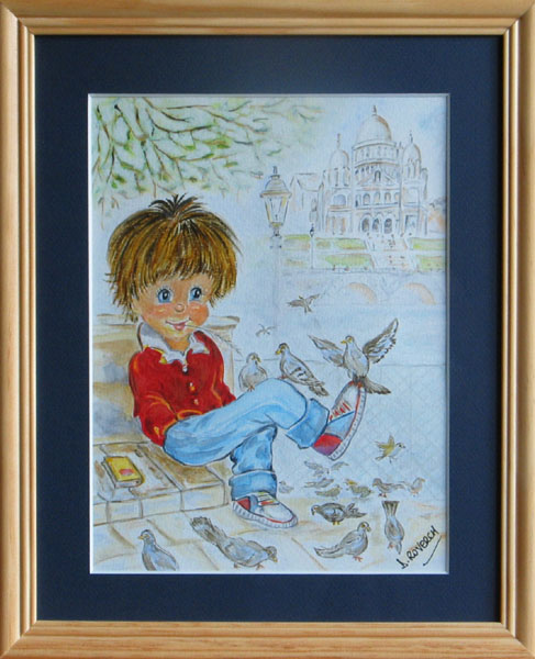 Assis pas loin du Sacré Coeur, notre petit Poulbot est distrait de sa lecture par une volée de pigeons ! Ce tableau a été réalisé en mai 2003. C'est une aquarelle de 18 x 24 cm