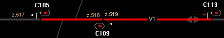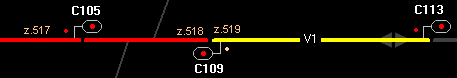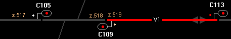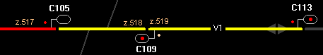 Le train franchit le C105 ouvert et attaque la zone 518. Aussitôt la fermeture automatique du C105 se produit (car nous sommes en DA). Ce signal présente alors l'indication C.